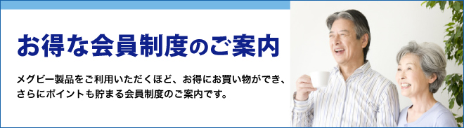 1年間のお買い上げ金額に応じてメグビー製品を割引価格にてご購入いただけます。会員ランクの集計は毎月行いますので条件を満たせば翌月から特典をご利用になれるお得なサービスです。さらに、お支払いに使えるポイントも貯まり、その他にもさまざまな特典をご用意しております。