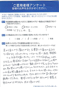 夫から疑問(メグビーを飲んでいることの効果の)を持たれたので、試しに1ヶ月飲まずにいたところ、2週間して歯ぐきの痛みに悩まされ、疲れ方もひどく再びメグビーを飲みだしたら、両方とも治まりました。